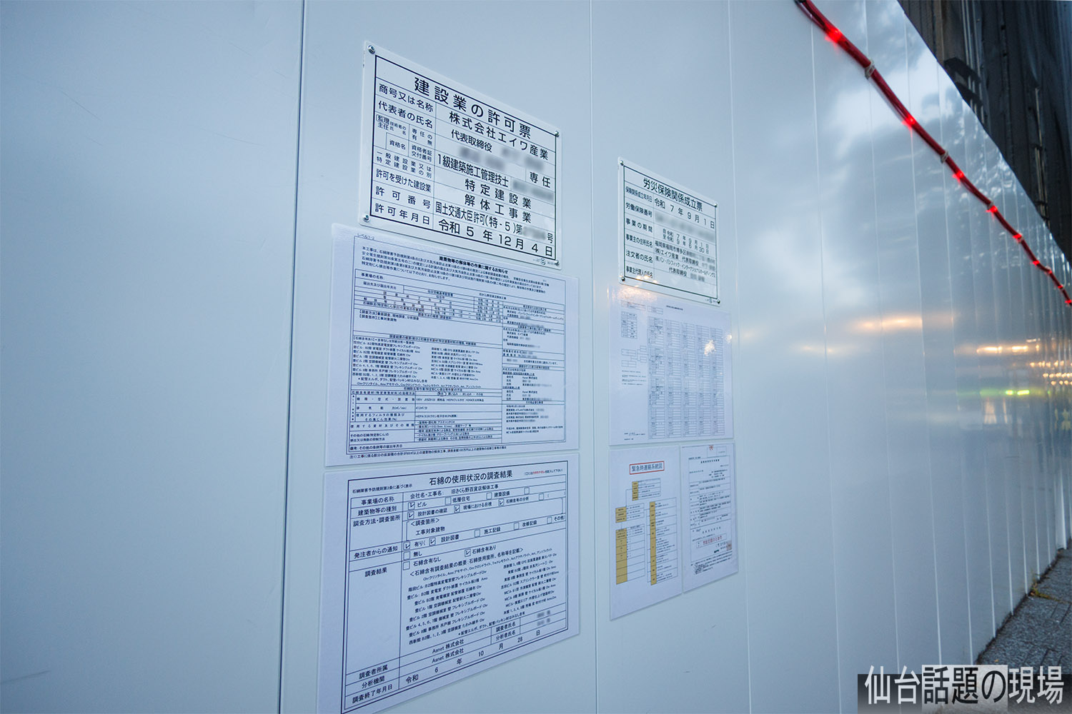 青葉通側の仮囲いの1ヵ所に、工事関係の掲示物が貼りだされていました。昨日は無かったので、今日の昼頃に貼られたものと思われます。