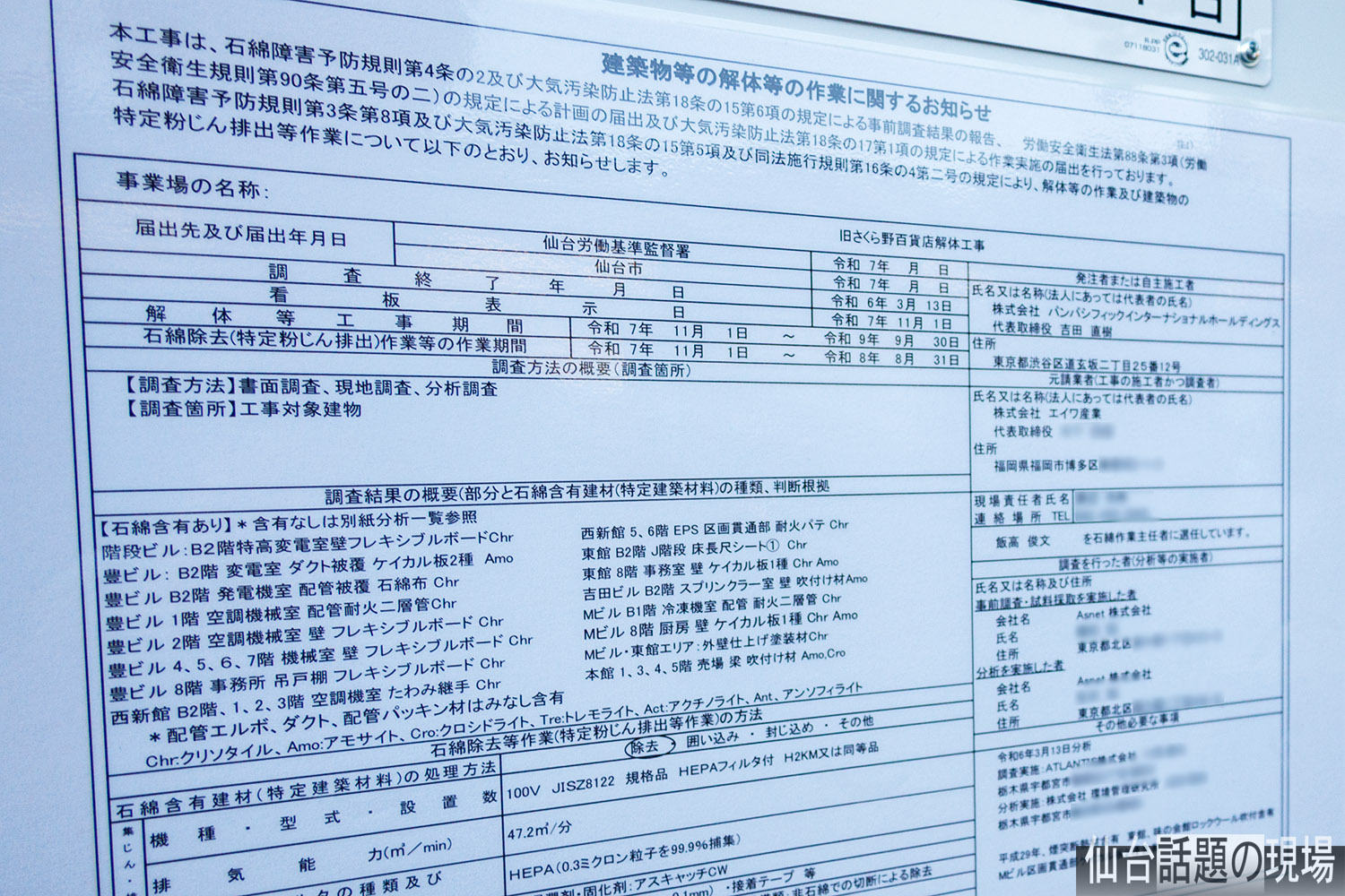 旧さくら野百貨店「解体等の作業に関するお知らせ」が掲示されて解体工事の期間が判明しました・2025年10月