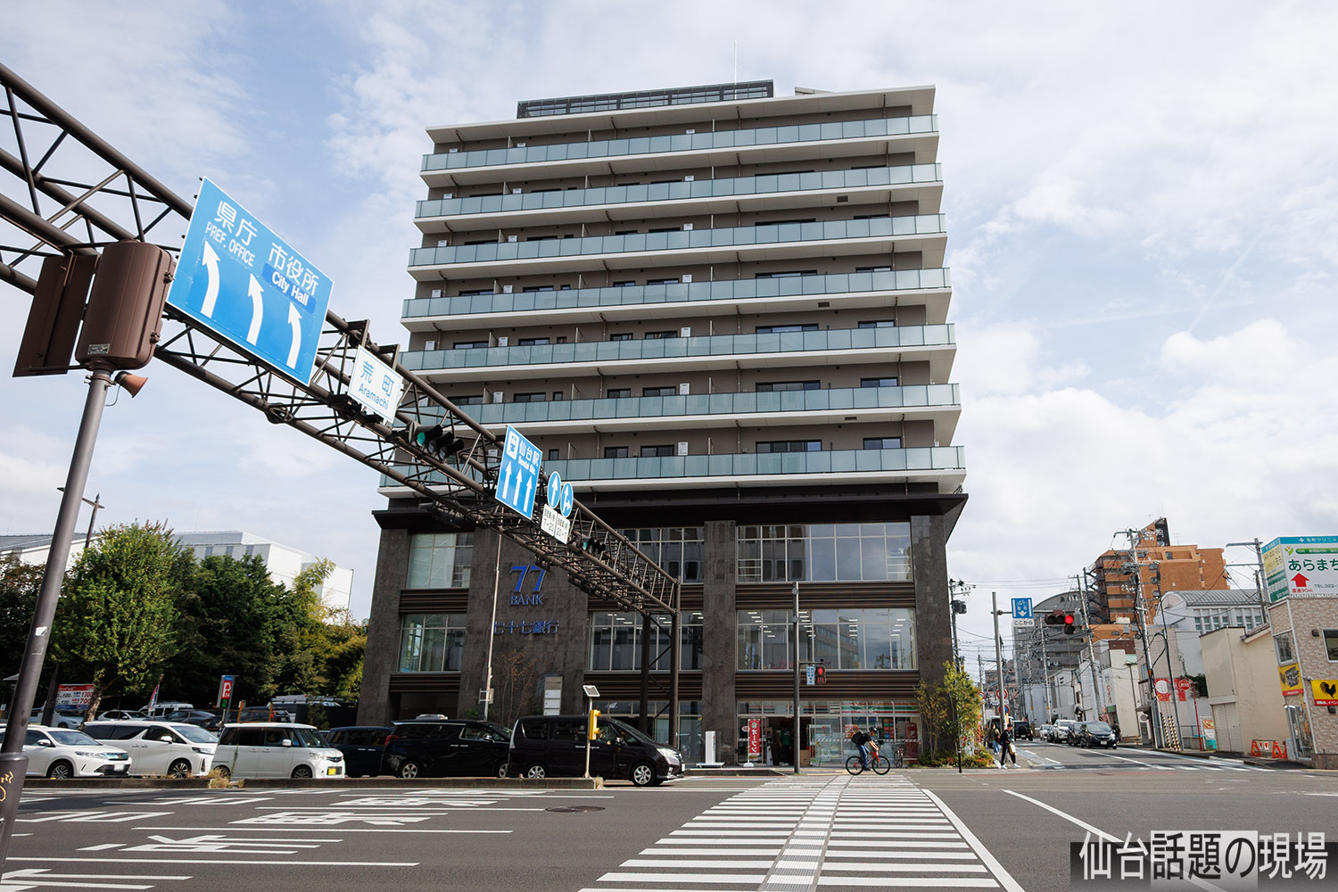 若林区荒町で、七十七銀行荒町支店兼八木山支店の新しいビルが完成しました。荒町支店の古いビルがあった場所で建て替えられて、八木山支店も統合されました。