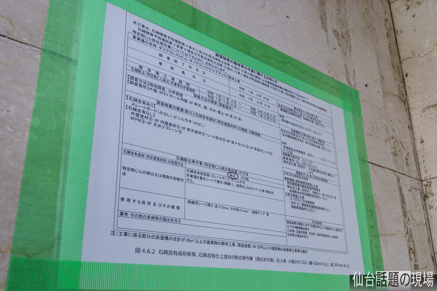 それによると工事名は「ダイヤクレストビル・ダイヤクレストビルアネックス解体工事」で、作業は今年11月4日から令和8年10月31日まで行われます。有害な石綿(アスベスト)の除去作業が12月15日までかかるそうです。