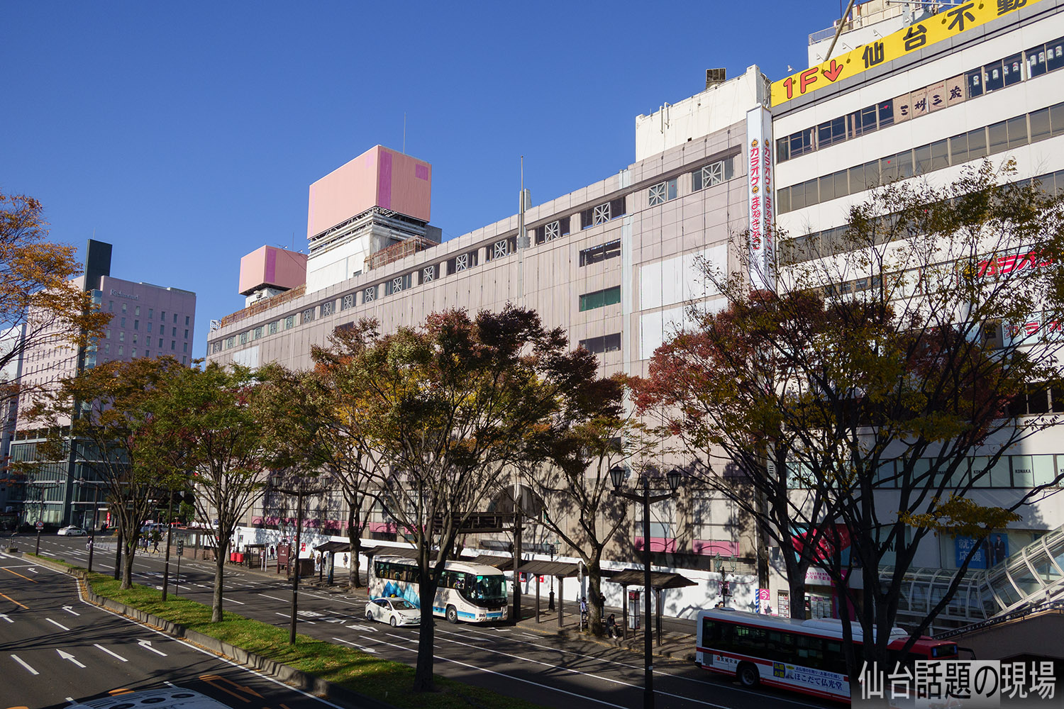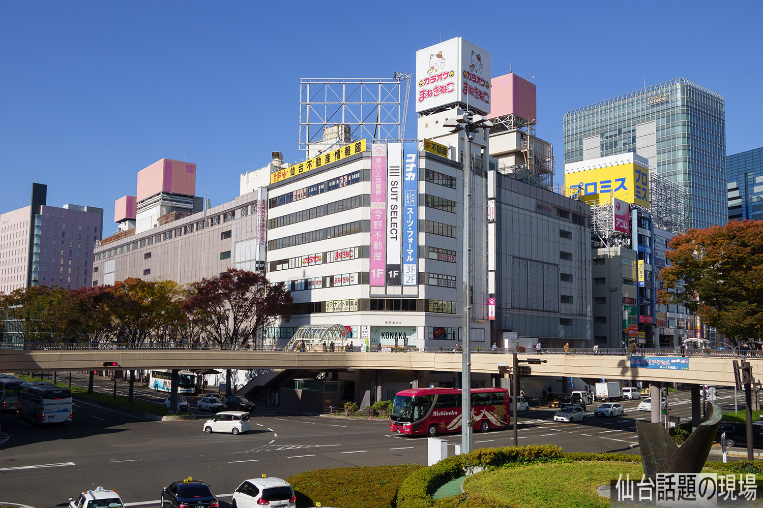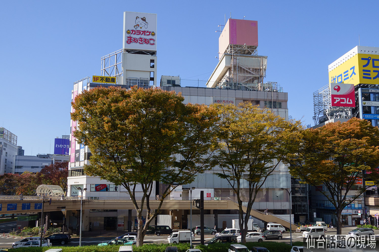 仙台駅を出ると、青葉通沿いの右側にあるのが旧さくら野百貨店の建物です。ちなみに角地の「カラオケまねきねこ」の看板のあるビルは別のビルです。