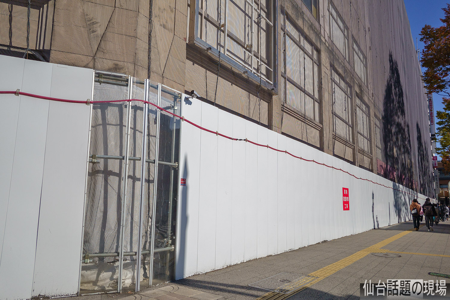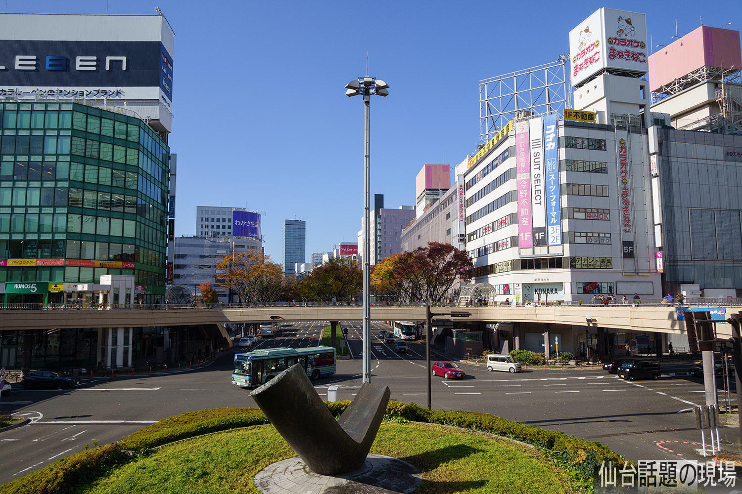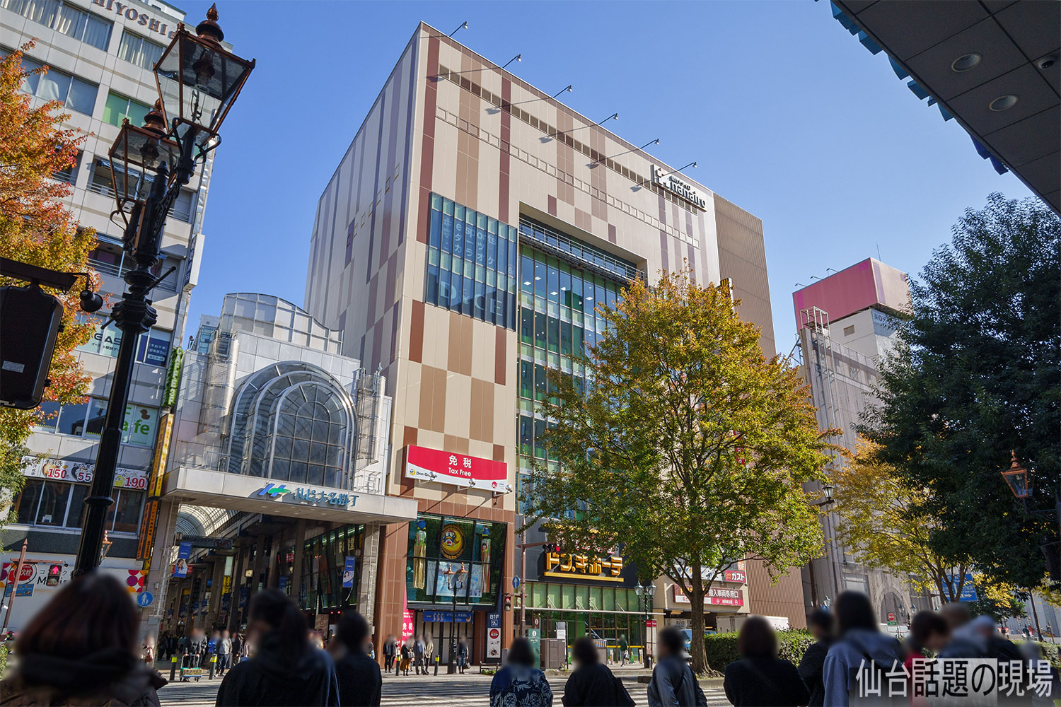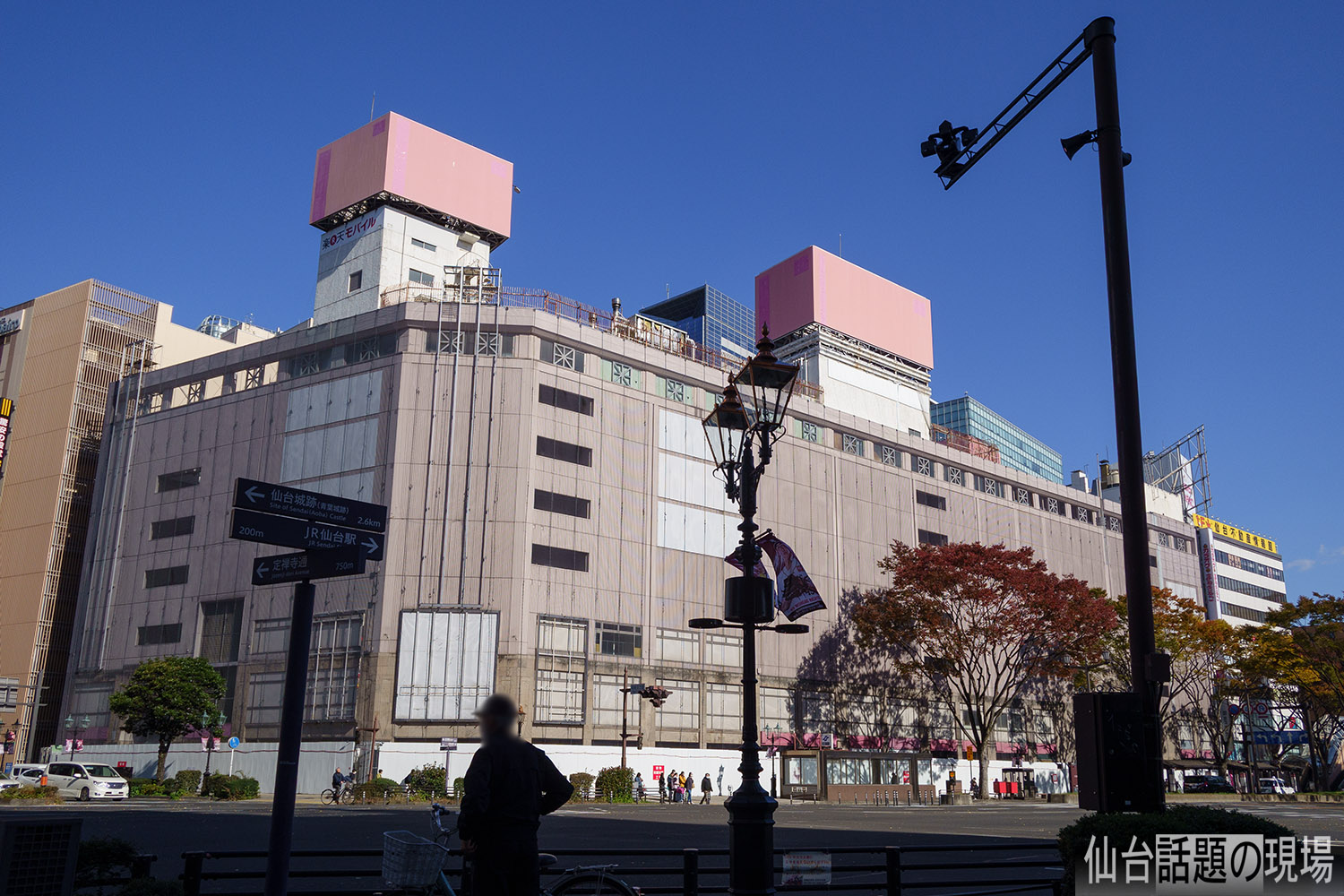 仙台駅を出ると、青葉通沿いの右側にあるのが旧さくら野百貨店の建物です。ちなみに角地の「カラオケまねきねこ」の看板のあるビルは別のビルです。