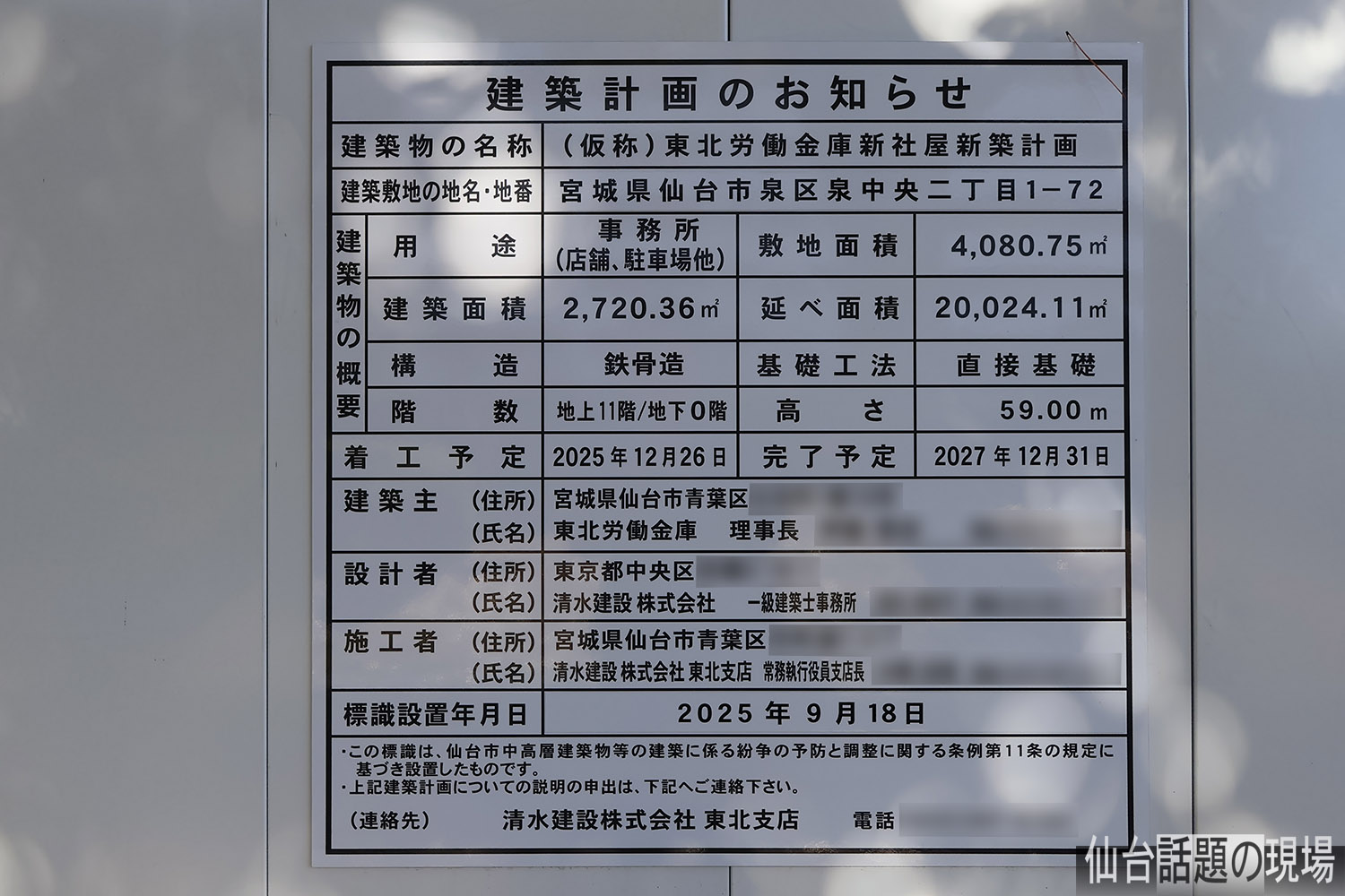 それによると、ここに建設されるのは「(仮称)東北労働金庫新社屋新築計画」で、敷地面積4,080.75㎡、建築面積2,720.36㎡、鉄骨造の地上11階建てで他kさ59.00m、延べ面積20,024.11㎡の規模のビルです。