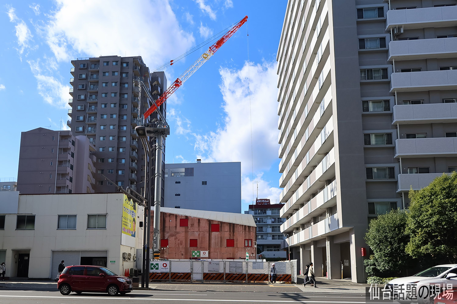 北四番丁駅近くの懐仁堂ビル跡地にクレーンが設置されました「(仮称)K‐HK青葉区木町通計画」・2025年11月
