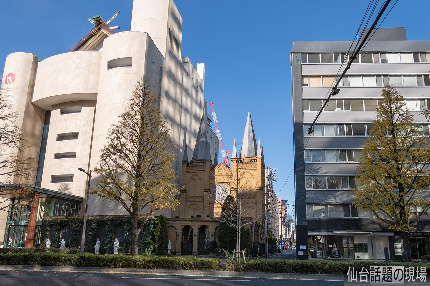 広瀬通側から見たら、パレスへいあんの教会の背後に建設用のクレーンが見えました。新しマンションは20階建てなので、完成したら建物の上部が見えそうですね。「(仮称)青葉区本町一丁目計画新築工事」は、2027年3月31日の完成予定です。