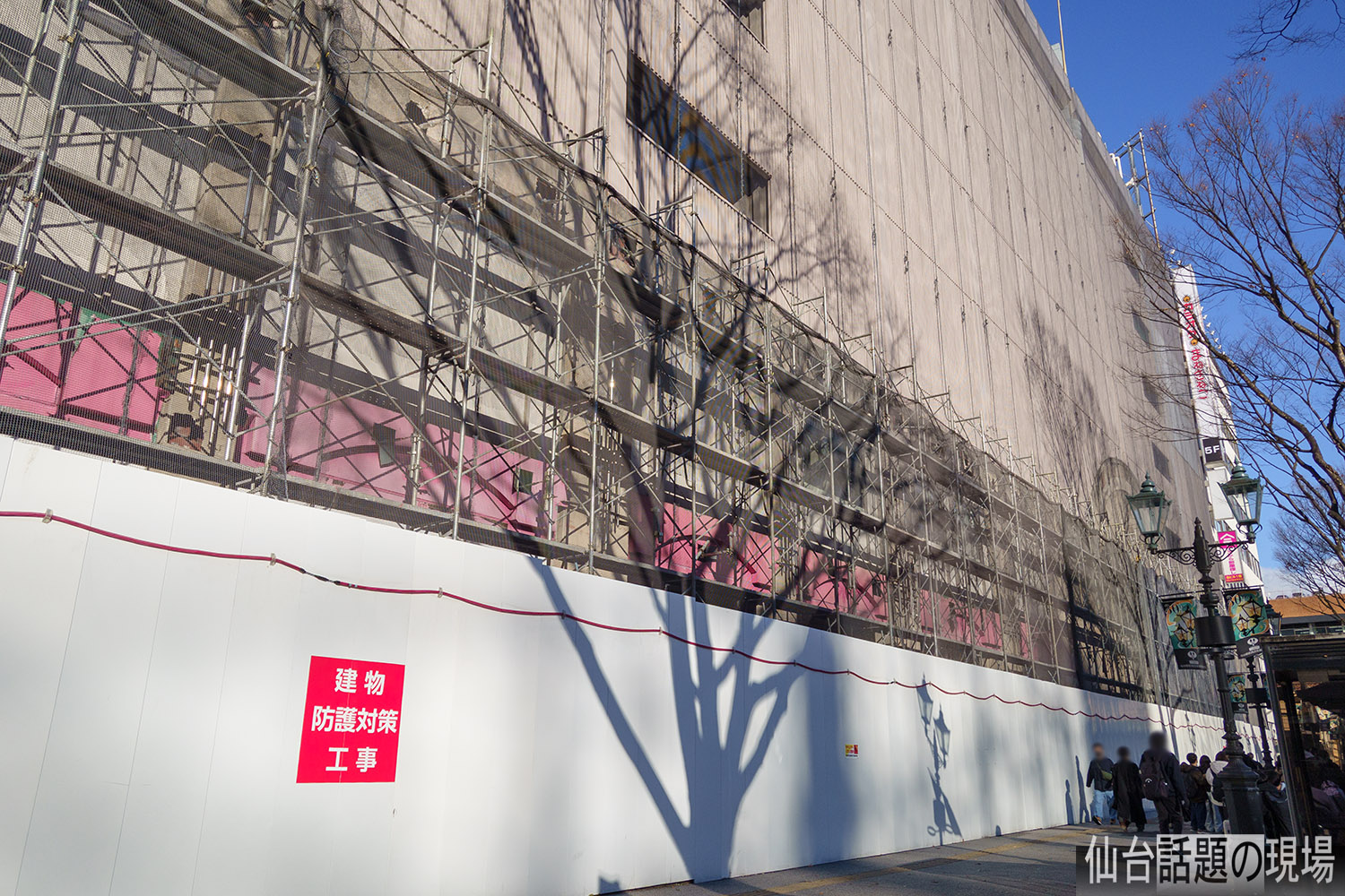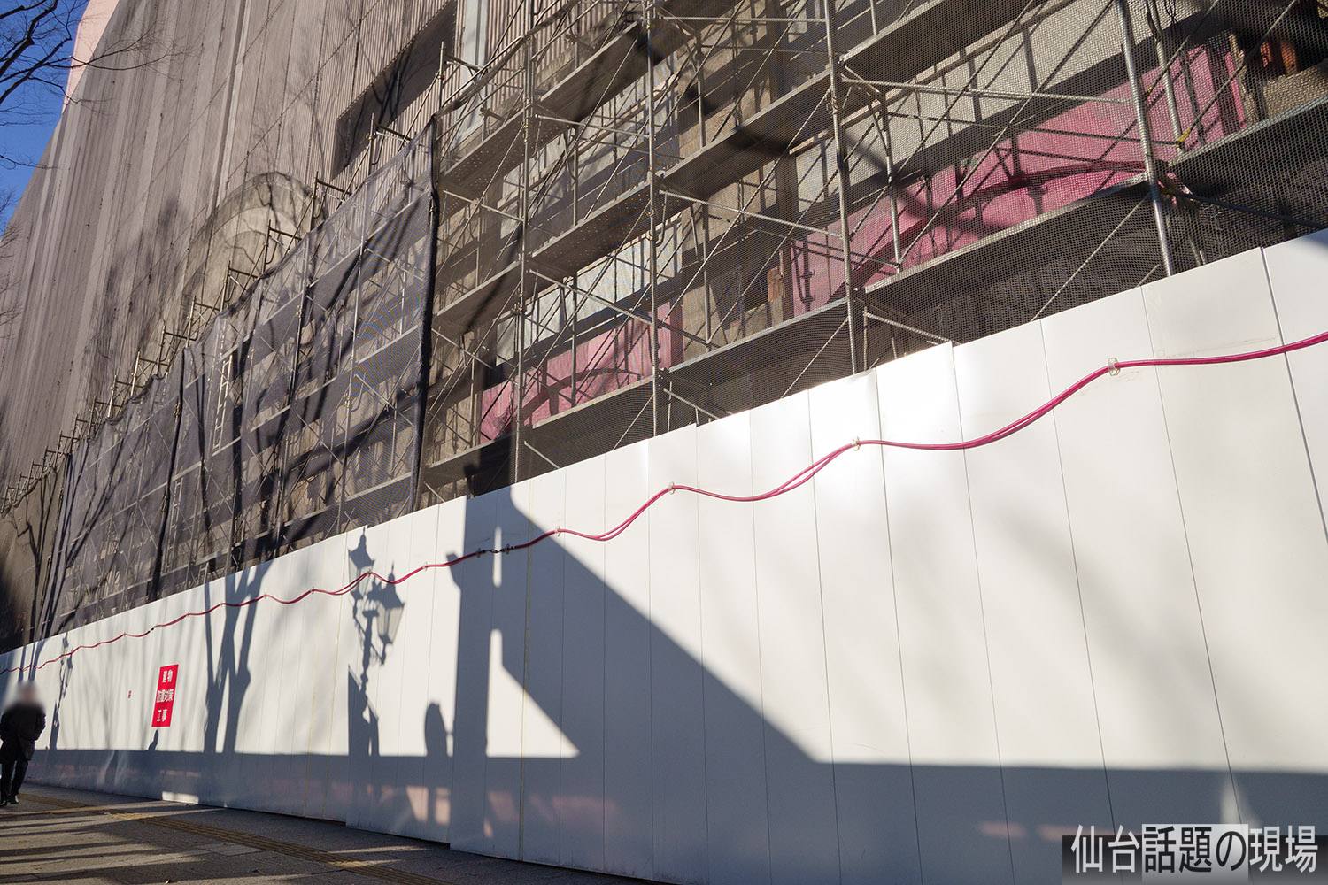 政岡通のほうから始まった足場の取り付け作業が青葉通側でも始まって、仮囲いの白いパネルの上に足場が組み上がって来ていました。