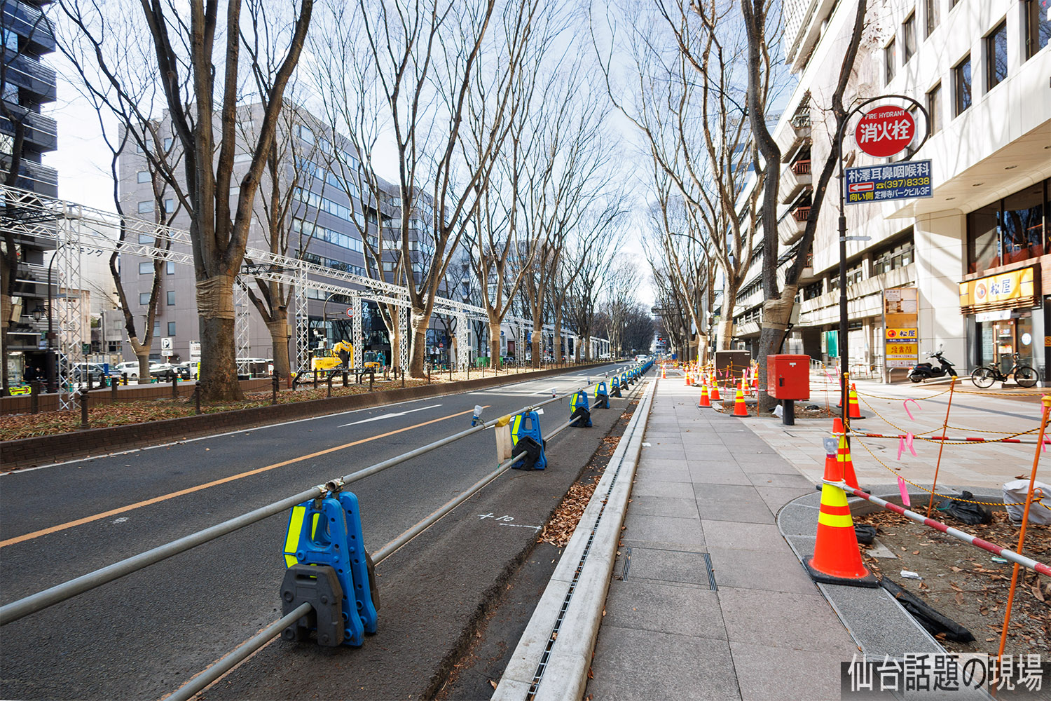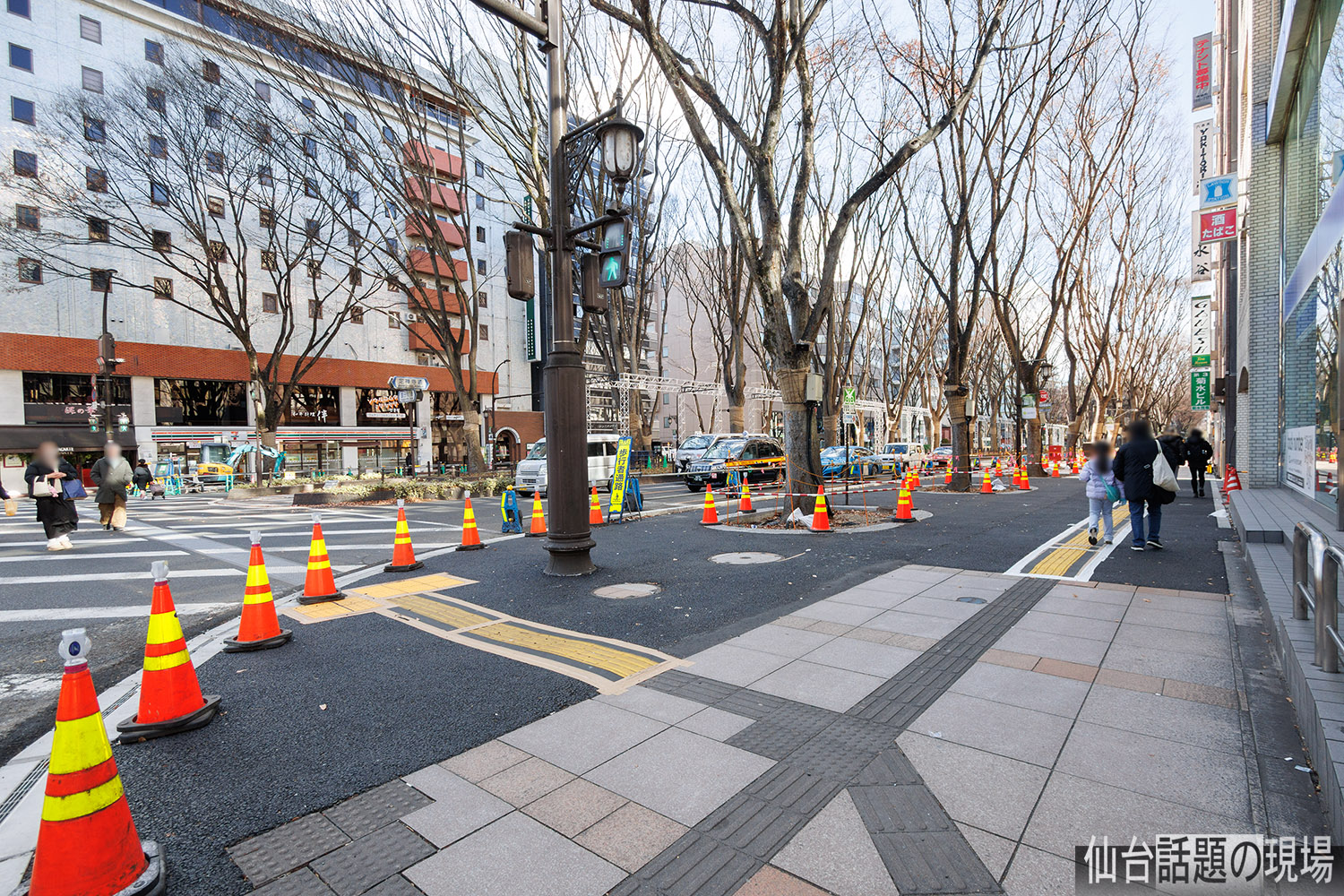 国分町通との交差点から東京エレクトロンホール宮城の前の区間では、歩道の再整備工事が、ほぼ終わりに近づいているようで、広くなった歩道が歩けるようになっていました。