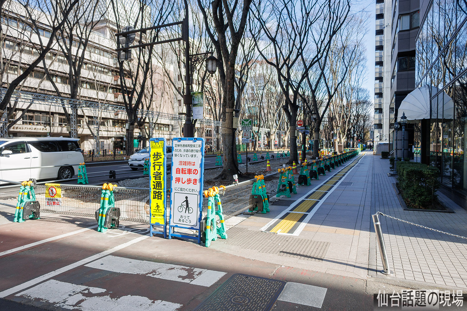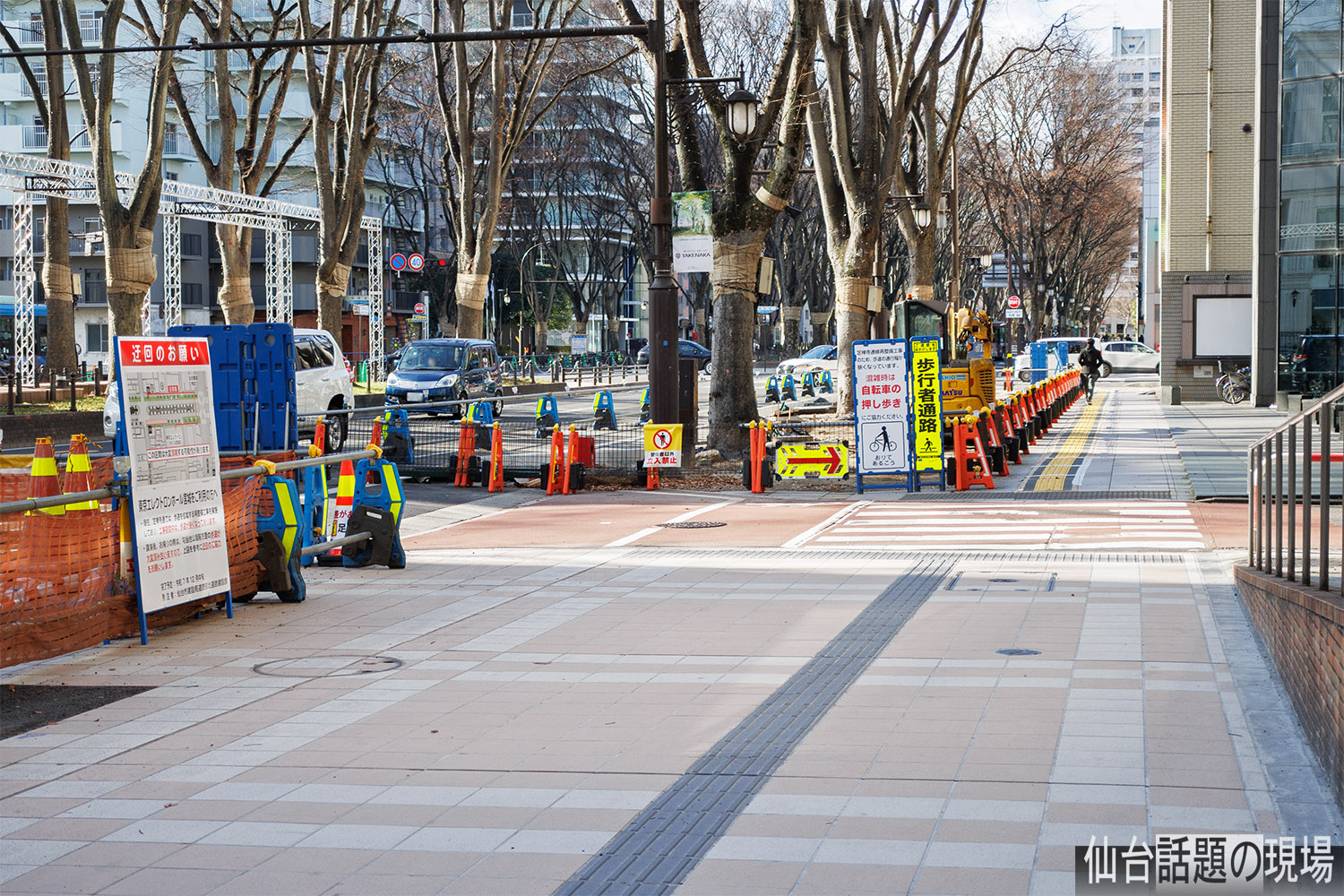 定禅寺通の北側の歩道は工事が終わりに近づいていましたが、南側の歩道では、まだ工事中で歩道が狭くなっていました。こちらも今年中には終わるでしょうか。