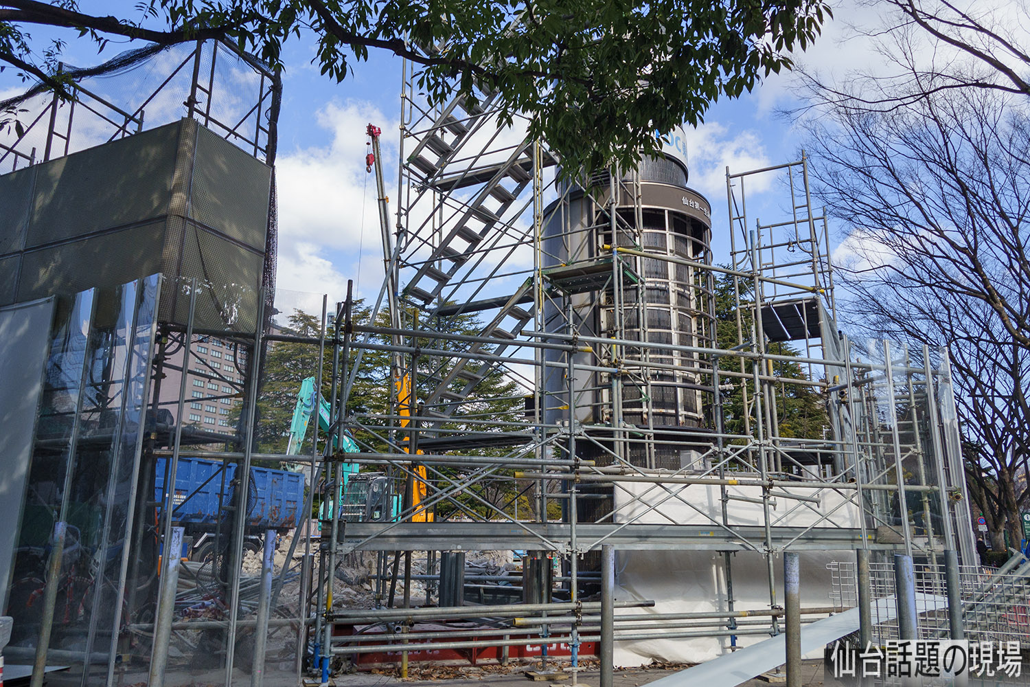 残っているのは定禅寺通側の入口前にあった円筒形の看板だけでしたが、これも足場が取り付けられて解体が始まるところでした。