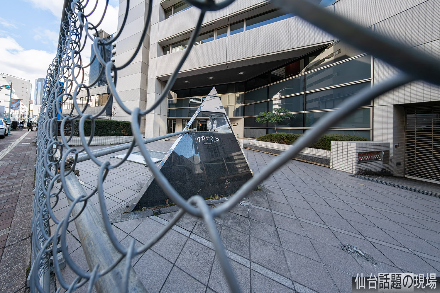 入口の前には三角形のオブジェがありますが、上部のガラスが壊されてフェンスを支えるための鉄パイプが括り付けられていたので、完全に閉鎖されたようですね。アカデミア館を象徴するオブジェが壊されているので、予備校の校舎としての使用が続けられることは無さそうな感じです。