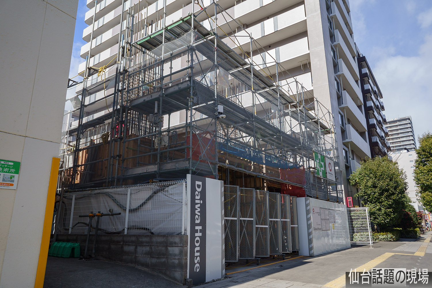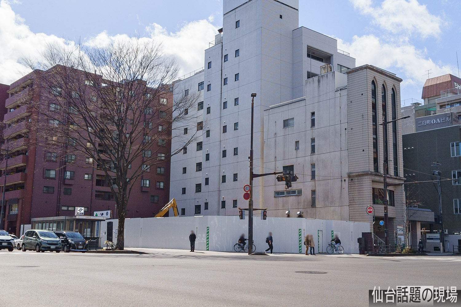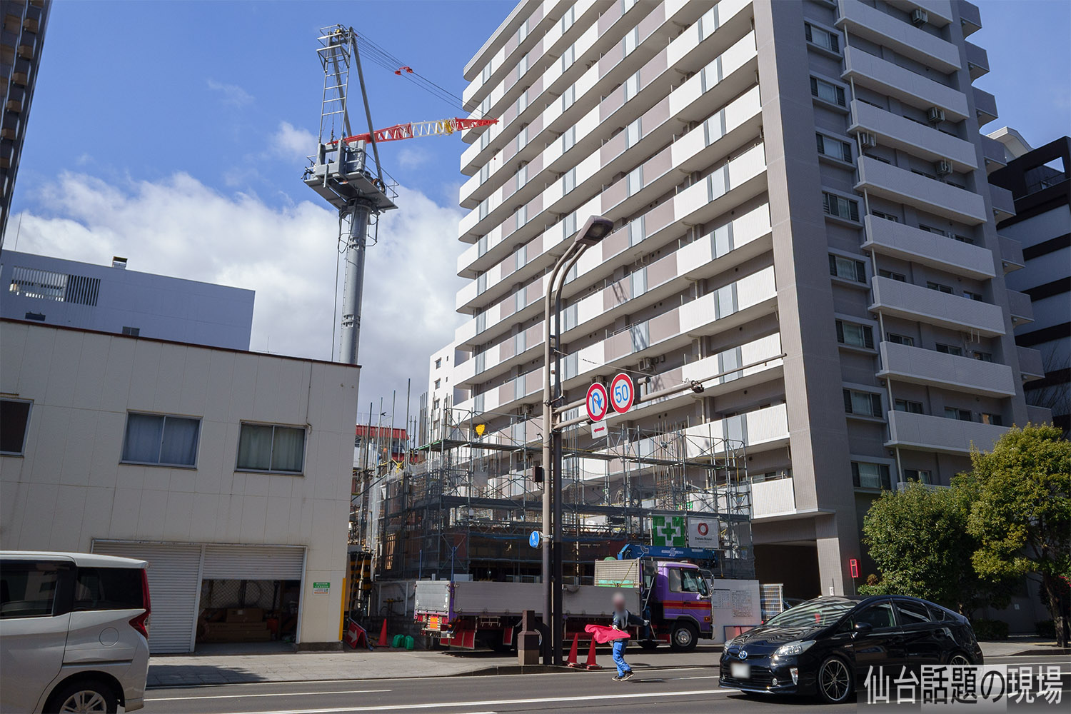 更地になっていたカルコスビル跡地の周囲に仮囲いが立てられて、敷地の中で重機が作業をしていました。「(仮称)プレミスト勾当台通」は、敷地面積934.97m、建築面積649.00m、鉄筋工ンクリート造一部鉄骨造の地上14階建てで、高さ45m、延べ面積6,400.00㎡、戸数99戸の規模のマンションで、2028年9月30日の完成予定です。