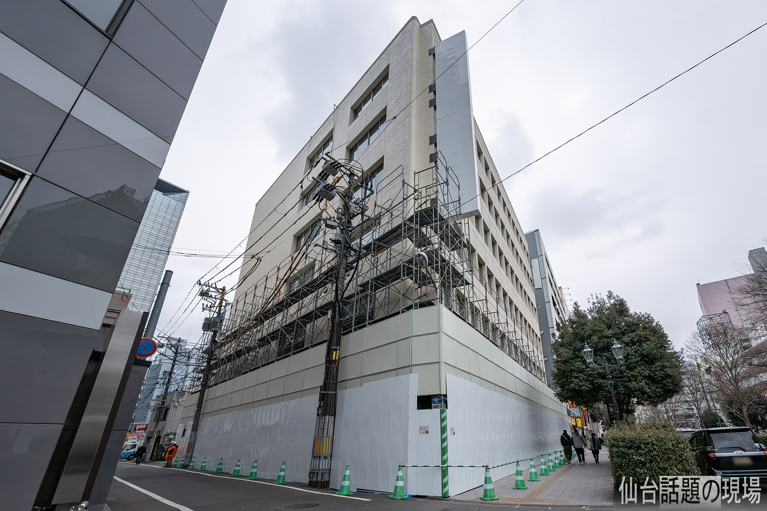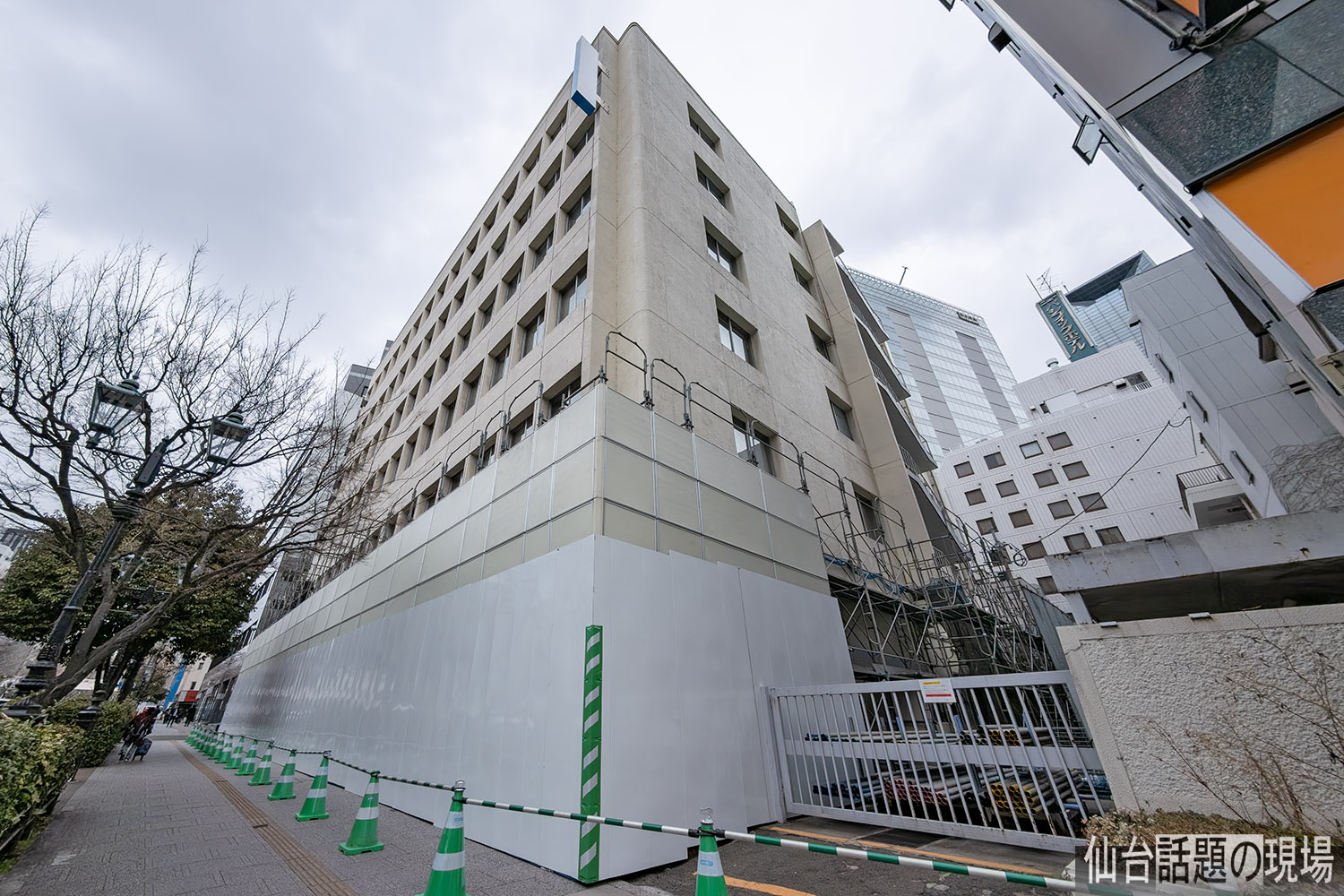 解体工事は2月26日に始まったばかりなので、ビルの周囲に足場と防音パネルを取り付ける作業が行われていました。