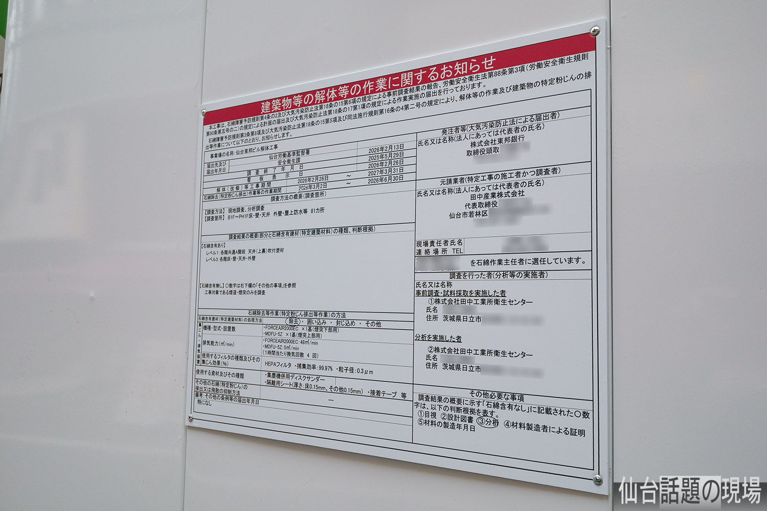 現場に掲示されている「建築物等の解体等の作業に関するお知らせ」によると、解体工事は2027年3月31日まで続くそうです。
