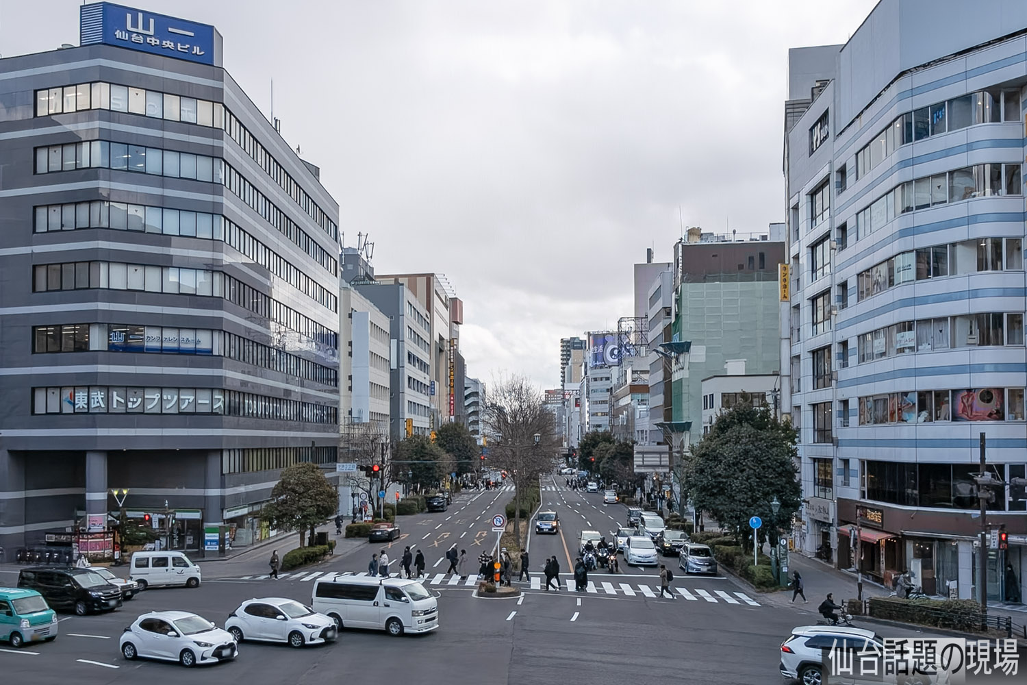 広瀬通交差点の北側にある歩道橋から南方面を撮影。