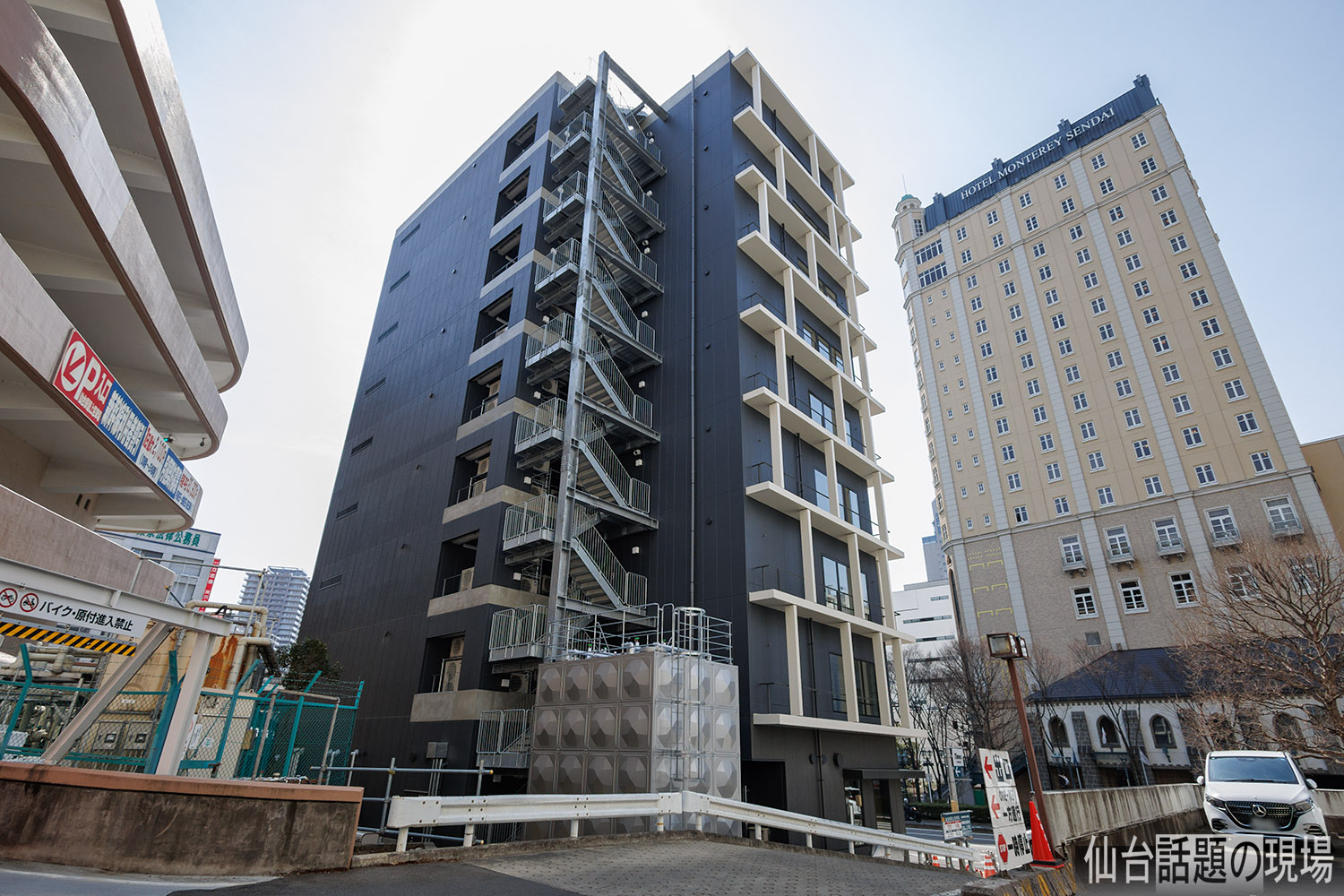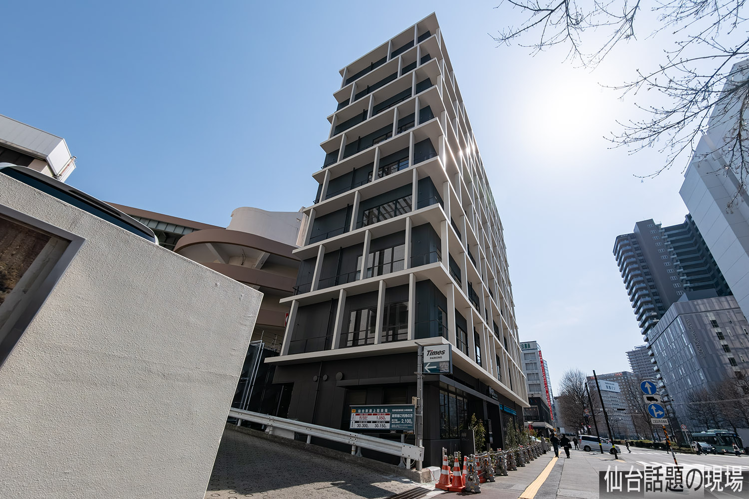 仙台駅の屋上駐車場へのスロープの前の土地で、スロープの入口と出口に挟まれた場所に建設されました。