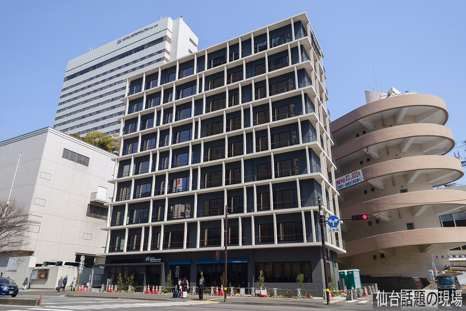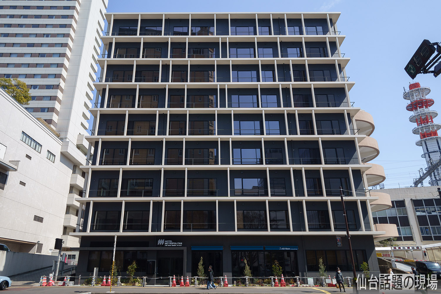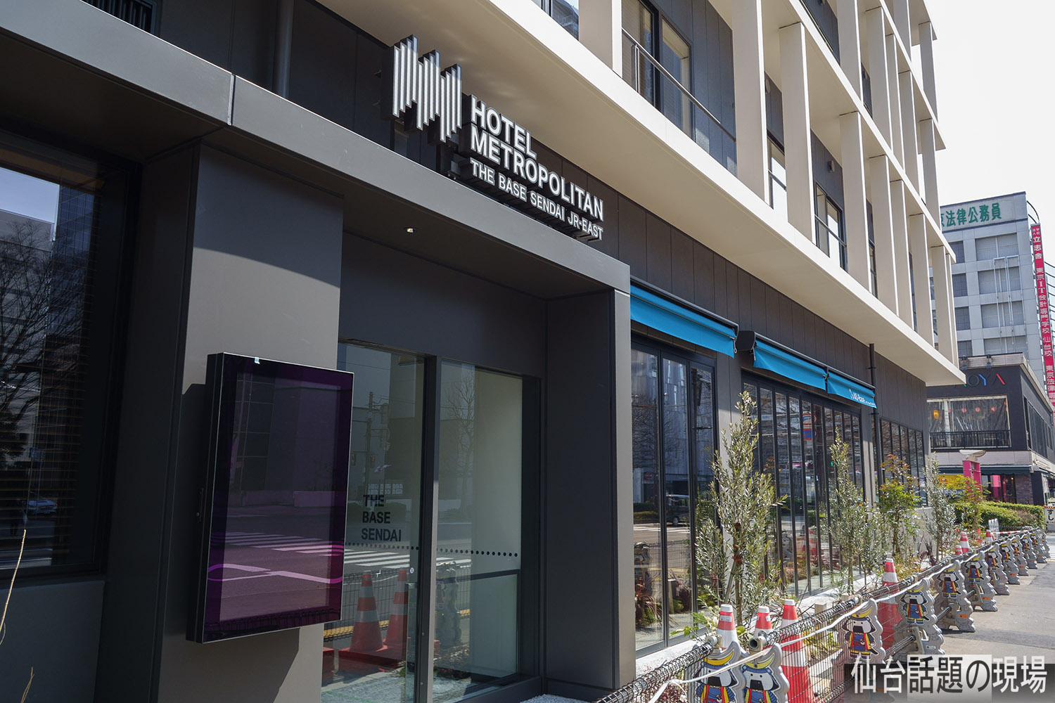 「ホテルメトロポリタンベース仙台」は、敷地面積470.98㎡、建築面積375.00㎡、鉄骨造の地上9階建てで高さ35.28m、延べ面積2,860.00㎡、客室数56室の、JR東日本系列のホテルです。