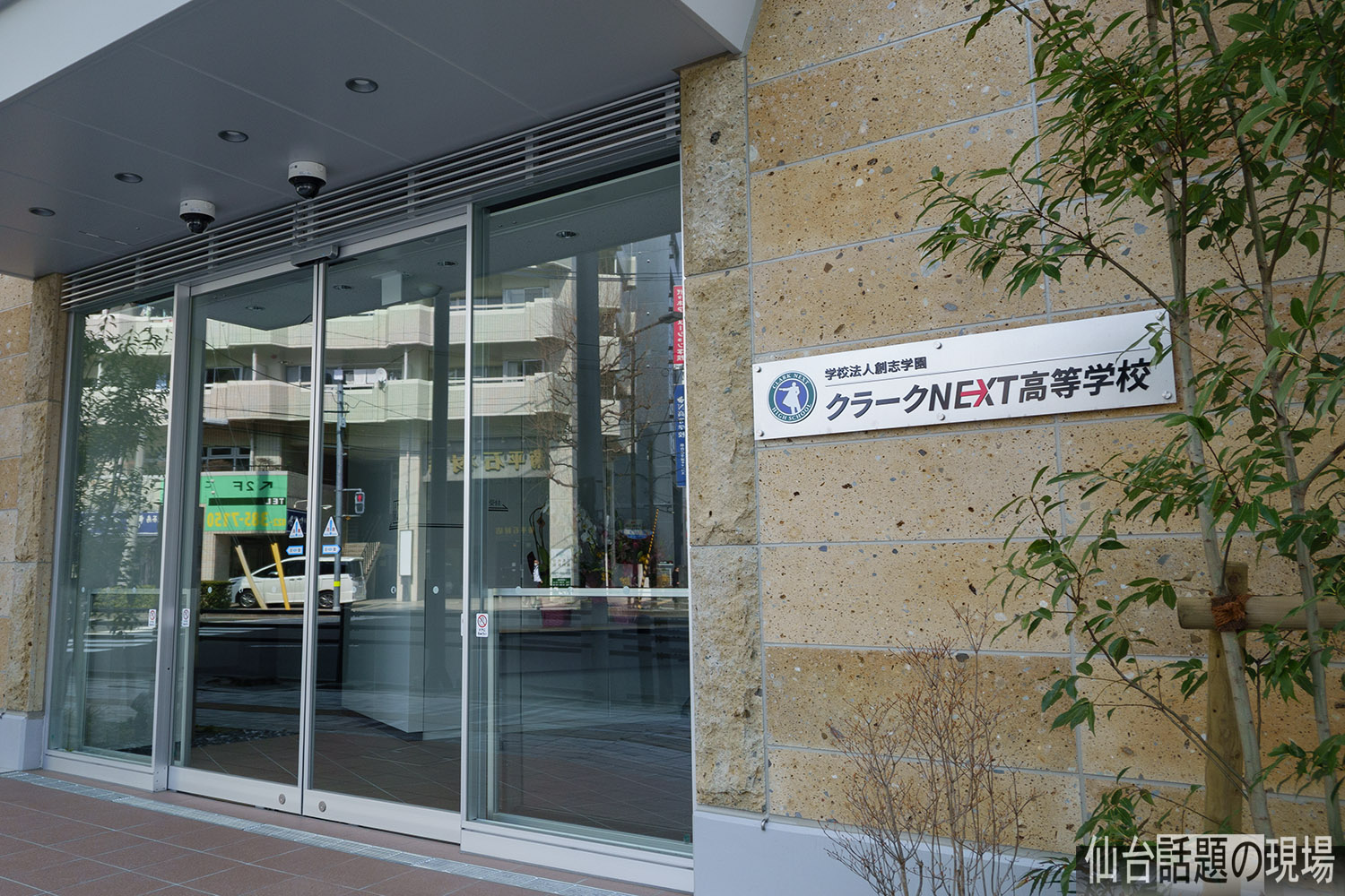 入口には「学校法人 創志学園 クラークNEXT高等学校」と書かれたプレートが取り付けられていました。