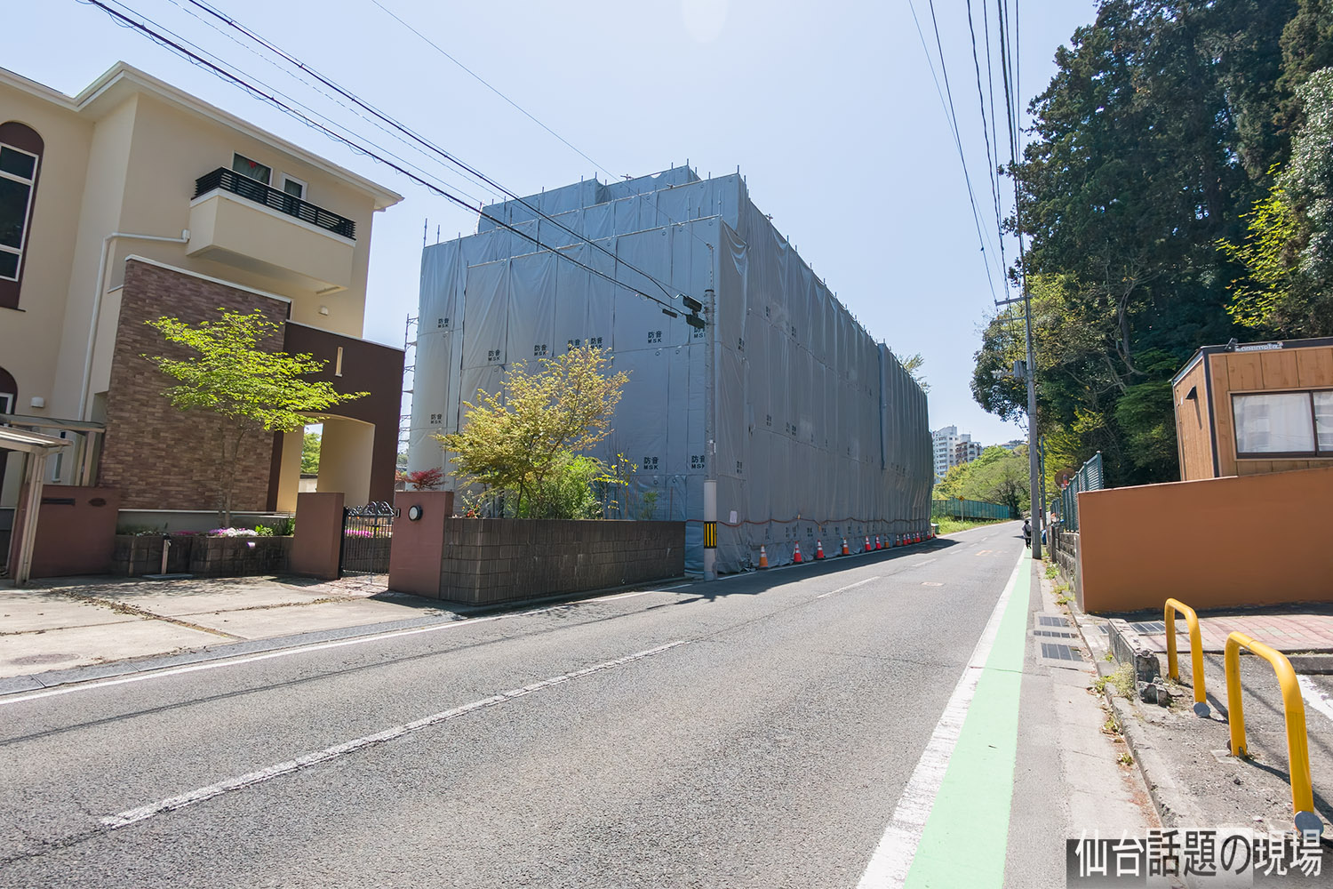 鹿落坂の手前にあった建物が、足場と防音シートで覆われて外観が見えなくなっていました。