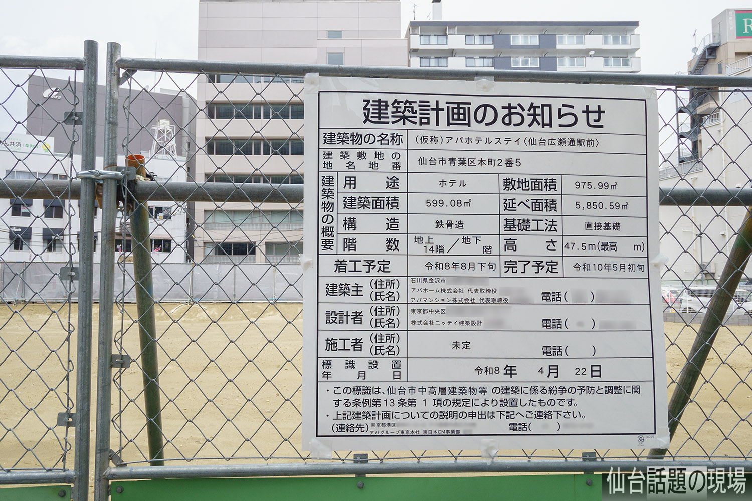 「(仮称)アパホテルステイ〈仙台広瀬通駅前〉」建設工事の着工は8月下旬、完成は令和10年(2028)5月初旬の予定です。